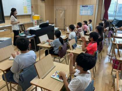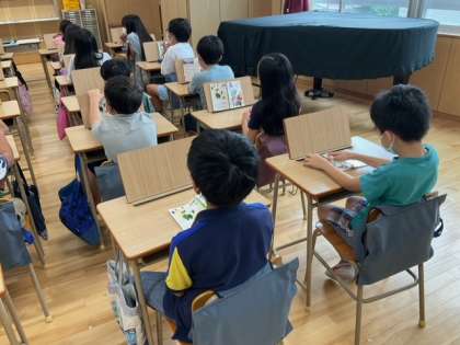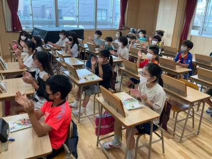 音楽の時間です。リズミカルな英語の歌を歌ったあと、音楽の記号についに学習しています。