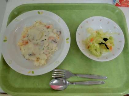 献立 えびクリームライス、コールスローサラダ、牛乳