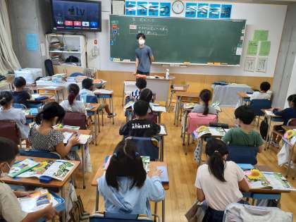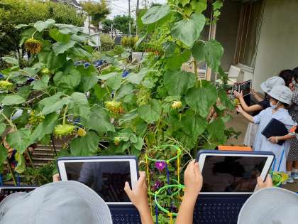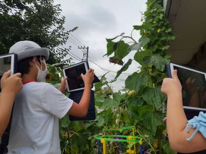 理科の時間です。ひまわりの花が咲いた後の様子を実際に見て、調べました。iPadで写真を撮ることで、拡大したり何度も見たりして調べることができました。