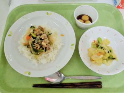 献立 ねぎ塩豚丼、えだまめサラダ、みたらしだんご、牛乳