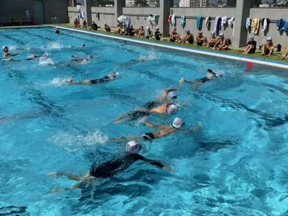 体育の時間です。けのび、バタ足、クロールというリズムが大事ですね。水泳の学習は、今週で終了です。