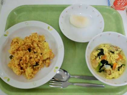 献立 ツナピラフ、卵とチーズのふわふわスープ、梨、牛乳
