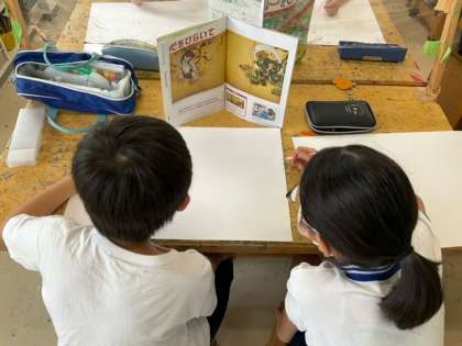 図工の時間です。心をひらいて「わたしの風神雷神」自分だけの風神雷神を、心をひらいて表現しよう!