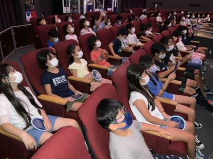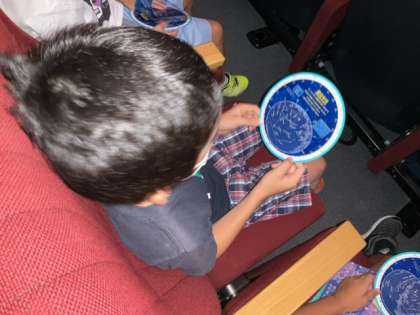 いよいよプラネタリウム鑑賞が始まります。初めは、星座早見盤の使い方を学習しています。