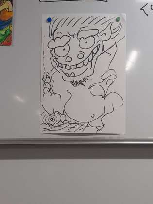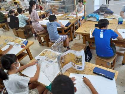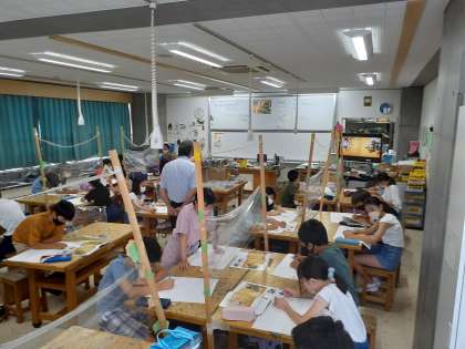図工の時間です。思い思いの風神、雷神を書いています。個性あふれる風神、雷神に感心しました。絵の具だけでなく、墨やマジック、クレヨンなどを使って仕上げていきます。