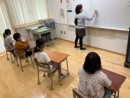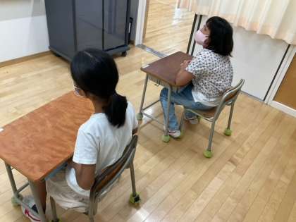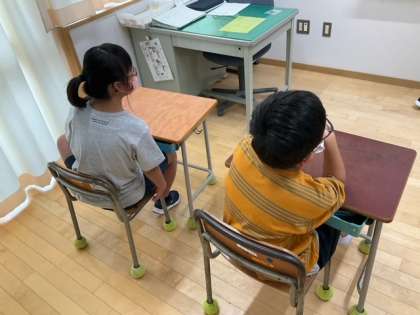 グループ学習の時間です。「ことばのかいだん」の学習をしています。「あ」で始まる言葉をたくさん考えています。