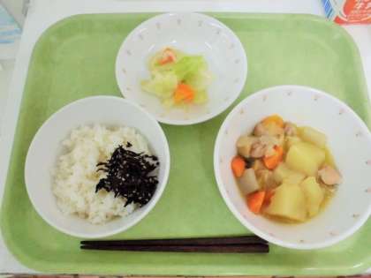 献立 ご飯、ひじきふりかけ、鶏じゃが、塩だれキャベツのサラダ、牛乳