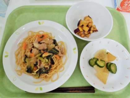 献立 豚肉と青菜のあんかけそば、きゅうりと大根のごま風味和え、お豆のかりんとう、牛乳