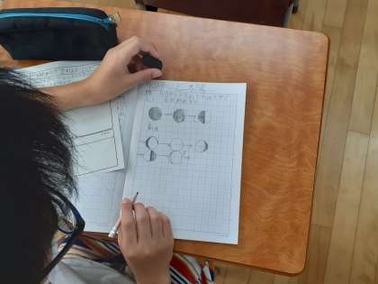 理科の時間です。月の形を思い出して、どのように変化していくのかを考えました。「右から明るくなる、左から欠ける」など、意見がたくさん出ていました。