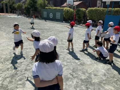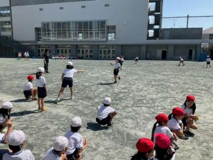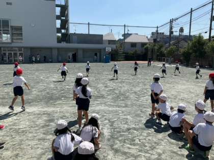 体育の時間です。折り返しリレーに取り組んでいます。「校長先生、リレーってすごく楽しい!」