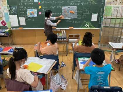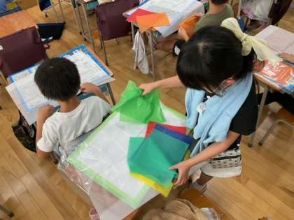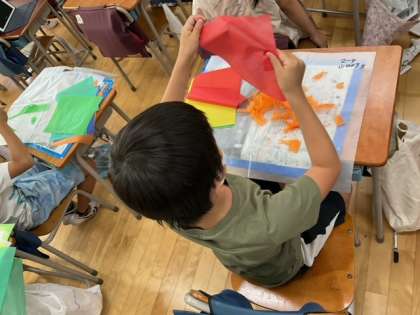 図工の時間です。「のりのり おはながみで」お花紙の手触りを楽しみながら、並べて重ねてすてきな作品を作ります。