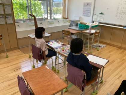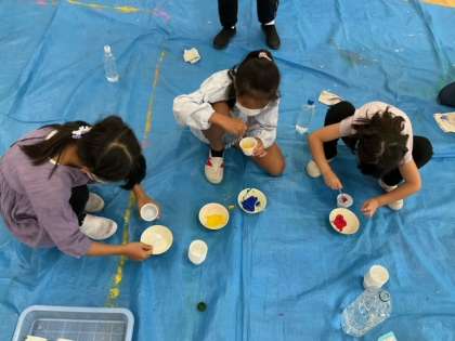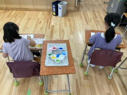 図工の時間です。「ふわふわ かきごおり」色を混ぜて、いちごやレモン、ぶどうのシロップを作っています。