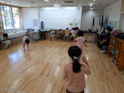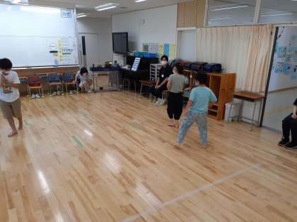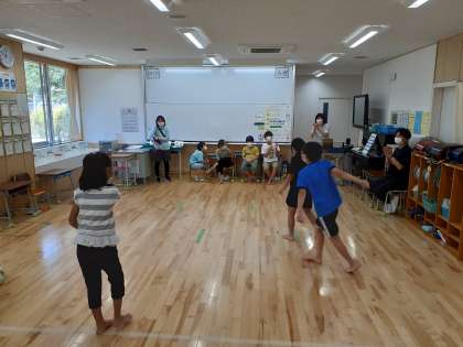 リトミックの時間です。忍者になりきって、つま先で音を立てずに歩いたり、走ったり、跳んだりしました。最後はかっこいいポーズで決め!