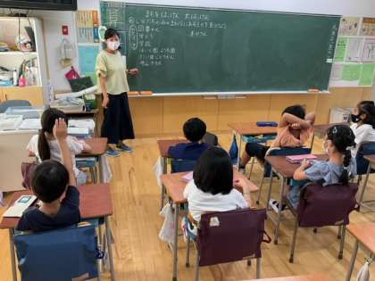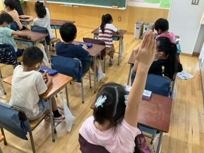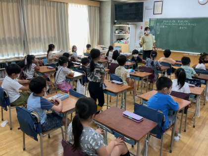 生活科の時間です。「まちをはっけん 大はっけん」自分たちの身の回りにある施設を、たくさん見つけています。