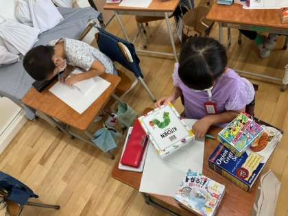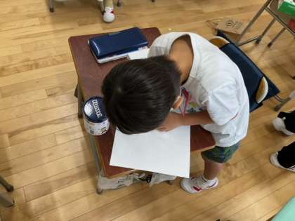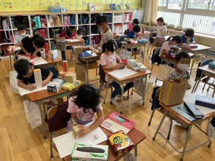 算数の時間です。家からいろいろな箱を持ってきました。箱の形を上手く使って、自分だけの新しい形を作っています。