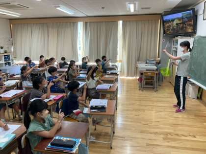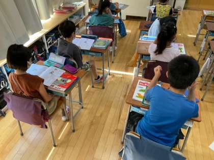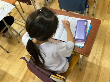 国語の時間です。書き順をしっかり覚えたら、ワークシートを使って練習をしていきます。