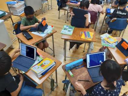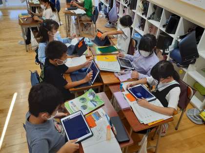 社会の時間です。世田谷区の農家の方がたくさんの種類の農作物を育てるための工夫を調べました。ロイロノートの共有の機能を使ってグループで調べたことを共有しながら学習をすすめています。