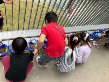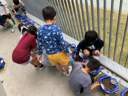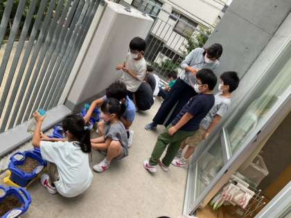 生活科の時間です。二十日大根の種をまいています。穴を五つあけて、種をまいて、土をかぶせて。成長が楽しみですね。