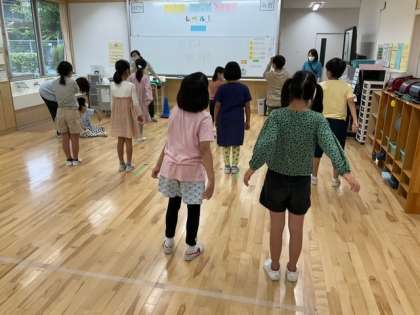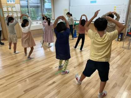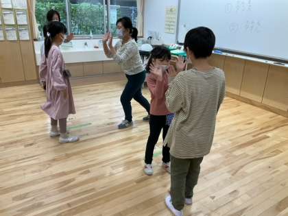 生活単元の時間です。ダンスを通して、左右交差の動きや正中線を越える動き、バランスなど、体の動かし方をコントロールする力を伸ばしています。