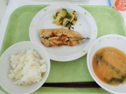 献立 ご飯、いわしの南蛮漬け、わかめサラダ、じゃが芋と玉ねぎのみそ汁、牛乳