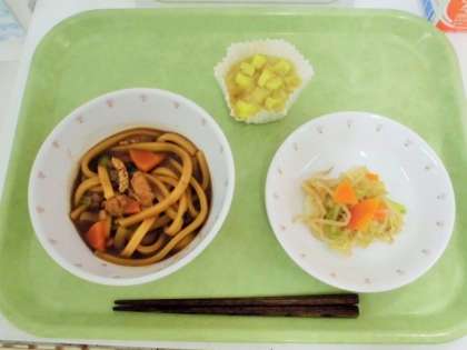 献立 みそ煮込みうどん、キャベツのレモンじょうゆ和え、鬼まんじゅう、牛乳