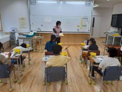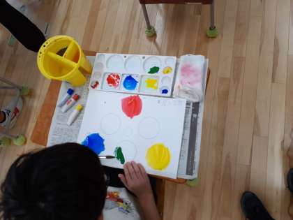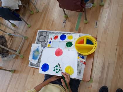 図工の時間です。色を混ぜることで新しい色を作りました。絵の具の量を調節して、たくさんの色ができました。