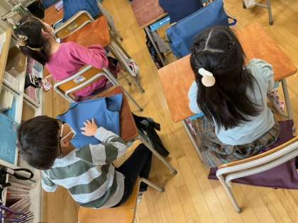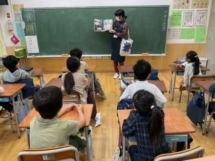 読書の時間です。司書の先生の読み聞かせです。「しらすどん」という、とてもおもしろいお話でしたね。