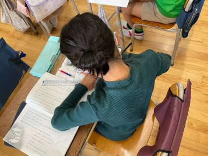 国語の時間です。「ちいちゃんのかげおくり」第一場面と第四場面のかげおくりでは、どちらか好きかを「心の数直線」で表しています。