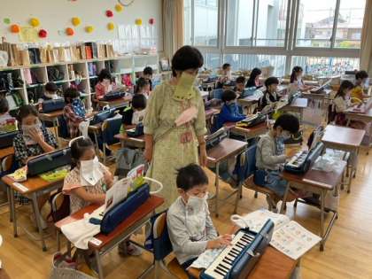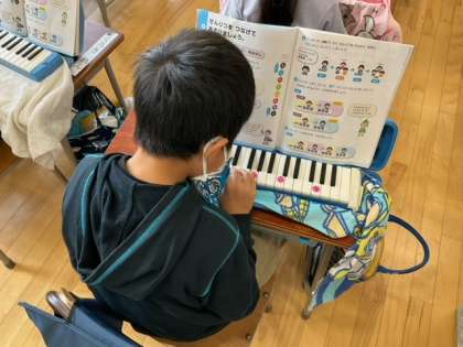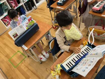 音楽の時間です。鍵盤ハーモニカの練習をしています。旋律をつなげて、楽しく遊んでいます。