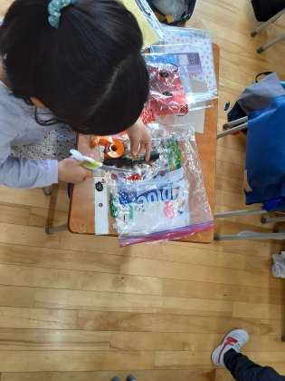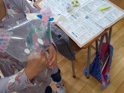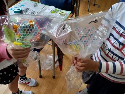 図工の時間です。ビニールに絵を描いたり、中にセロハンを入れたりして作りました。個性豊かなひかりのくにのなかまたちができました。