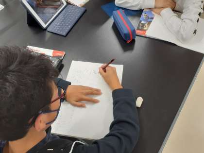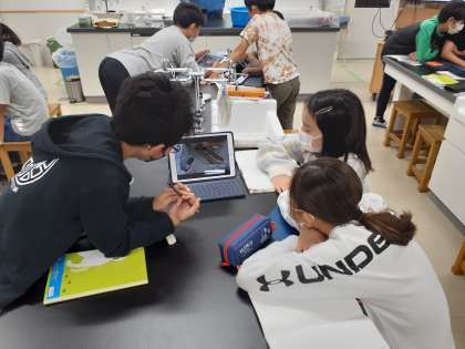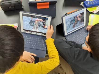 理科の時間です。実験の様子を撮影した動画を見て、詳しく調べています。何度も見ることができるので様子がよく分かりました。