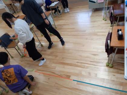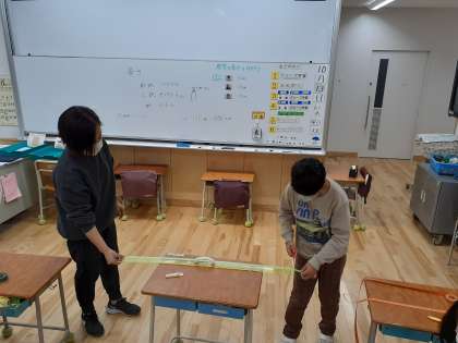 算数の時間です。教室の長さはどれくらいだろう?一mがいくつ分あるか調べました。