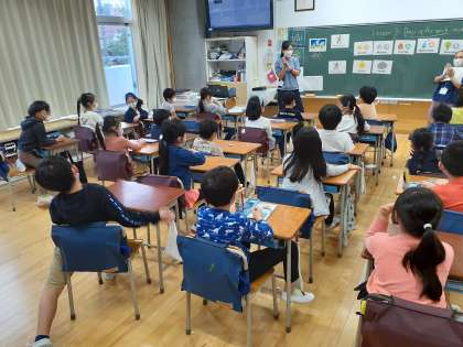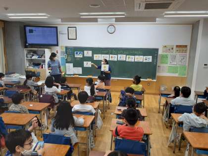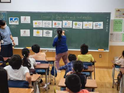 外国語活動の時間です。曜日と天気の言い方を英語で練習しました。