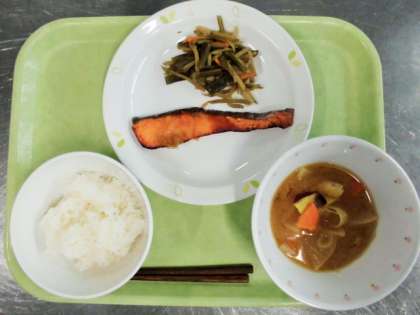 献立 ご飯、鮭のねぎ塩ソース、茎わかめのきんぴら、さつま汁、牛乳