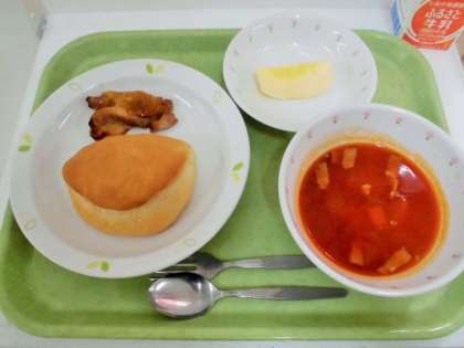 献立 照り焼きチキンバーガー、ミネストローネ、りんご、牛乳