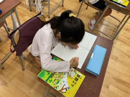 算数の時間です。かけ算の学習に取り組んでいます。昨日までの学習がしっかり身に付いています。