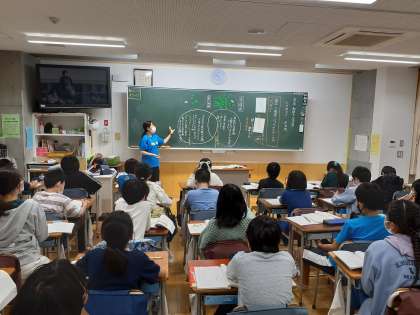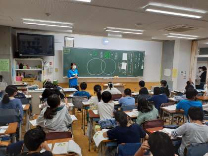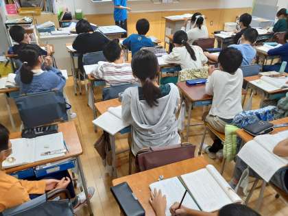 国語の時間です。複雑な心境の主人公の変化を場面ごとに比べて考えることで戦争について考えることができました。