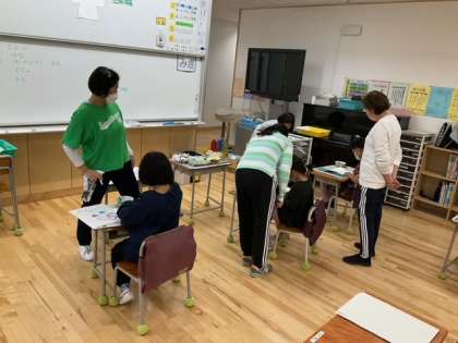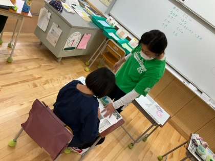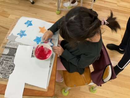 グループ学習「図工」の時間です。すてきなTシャツを作っています。星や月など、模様がすてきですね。