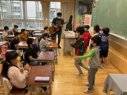 先生のギター伴奏でダンスと歌を楽しんだあと、しっかり気持ちを切り替えてお話しを聞いています。