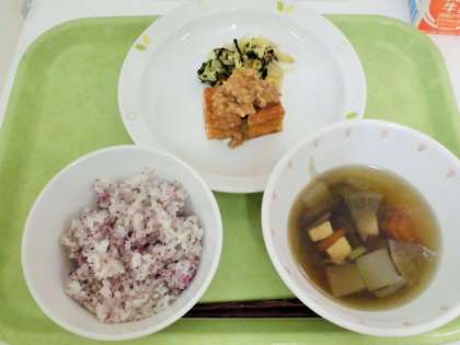 献立 ゆかりご飯、生揚げの肉みそかけ、小松菜ののり酢和え、けんちん汁、牛乳