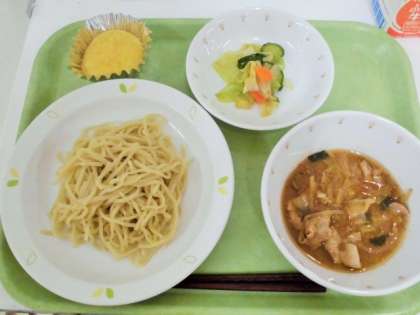 献立 みそつけめん、キャベツの中華甘酢サラダ、マーラーカオ、牛乳