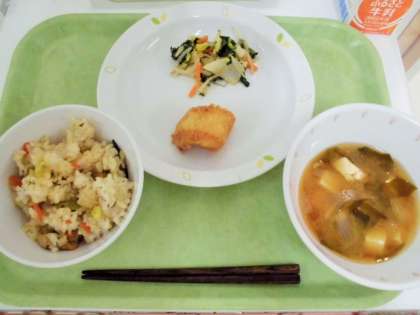 献立 秋の香りご飯、いかの竜田揚げ、野菜のごま和え、豆腐とわかめのみそ汁、牛乳