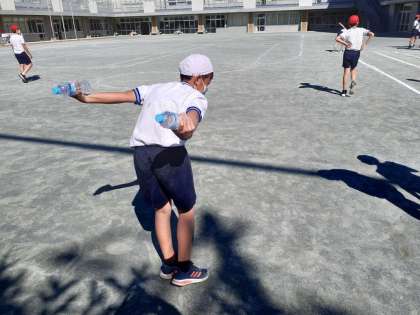 体育の時間です。ペッボトルを手にもって、腕を大きく振り上げる練習をしました。工夫した練習方法なので子供たちも意欲的に取り組んでいました。