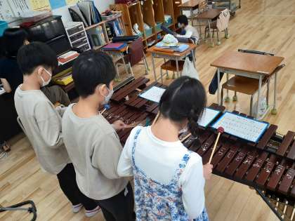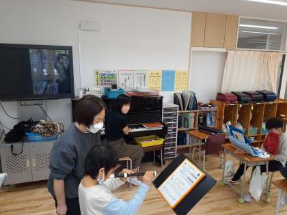 音楽の時間です。楽しそうな音色に引かれて、聞きに行きました。リコーダーや木琴が上手に弾けました。