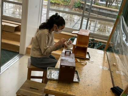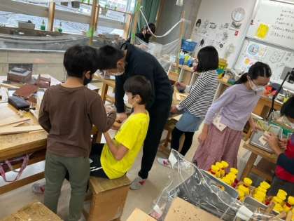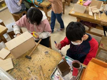 図工の時間です。「わたしはデザイナー 12さいの力で」ニスをぬって、仕上げの段階に入っています。