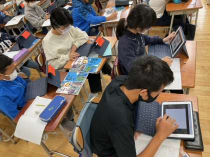 社会科の時間です。江戸時代の資料をもとに、江戸時代と現在の違いを見つけています。