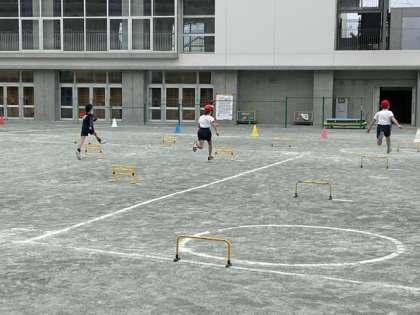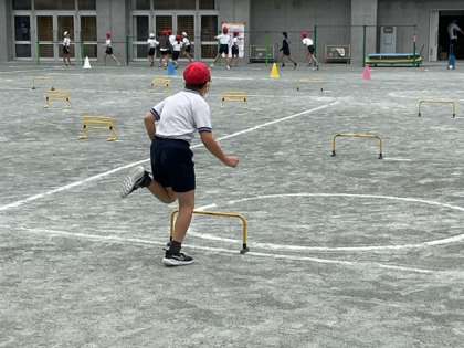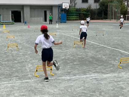 体育の時間です。ミニハードル走に取り組んでいます。できるだけ素早く、リズミカルに駆け抜けましょう!