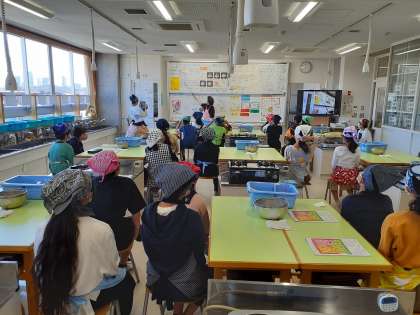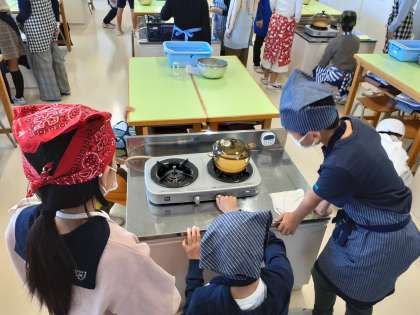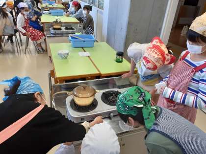 家庭科の時間です。「お米の旨味が感じられるご飯を炊こう」をめあてにご飯を炊きました。おいしいご飯ができそうです。