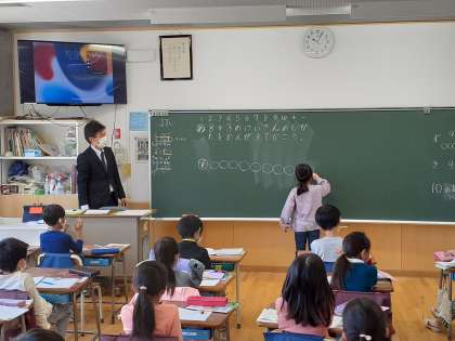 算数の時間です。8+3の計算の仕方を○図とさくらんぼ図を使って考えました。友達の考えをよく聞いて学び合いました。
