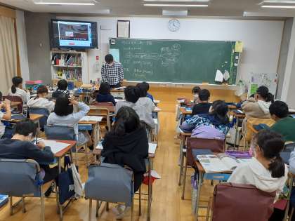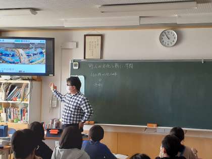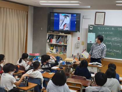 社会の時間です。江戸時代の町人の文化や学問について学習しました。資料をよく見て、先生の話をよく聞いていました。